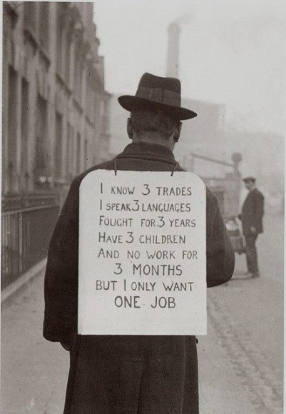 Amerikalı şəxs üzərində daşıdığ lövhə ilə iş axtarır.