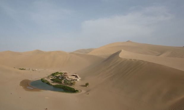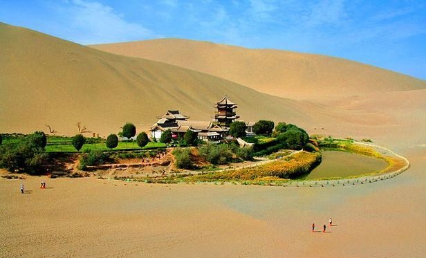 Bu tarixi vahə qumlar altında qalmaq üzrə idi ki, Çin hökuməti bu sahəni qoruma altına aldı. Vahə, Çinin şimal-qərb şəhərlərindən Dunhuang’a təxminən 6 km uzaqlıqdadır. Ayparaya bənzəyən görünüşü ilə Crescent Gölü ziyarətçilərini ovsunlamağa kifayət edir. Təxminən 2000 ildə meydana gəldiyi zənn edilən və demək olar ki, heç yağış yağmayan bu vahə səhralaşma sürətinin artması ilə yox olmaqdan son anda qurtarıldı. Göldəki su miqdarı son 30 ildə dramatik bir şəkildə azaldı. Bundan sonra çinli səlahiyyətlilər gölə yenidən su doldurdu. Bu vahəni görmək istəyən turistlər qum təpələrini dəvə səfəri ilə aşır.