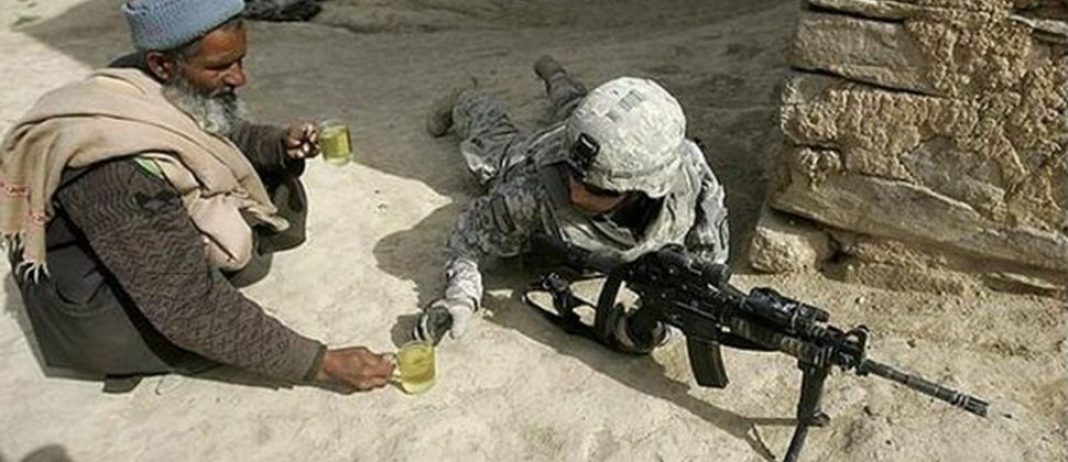 Əfqanıstanlıqoca amerikalı əsgərə çay verərkən