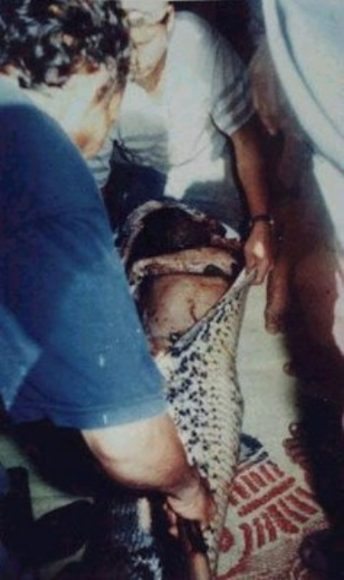 Öldürülən pitonun qarnını yaran kəndlilər talehsiz adamın cansız bədənini çıxarıblar.